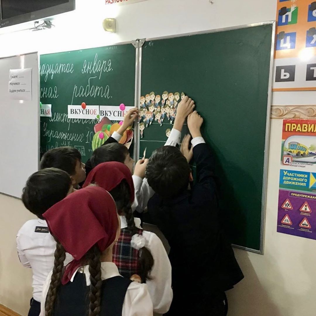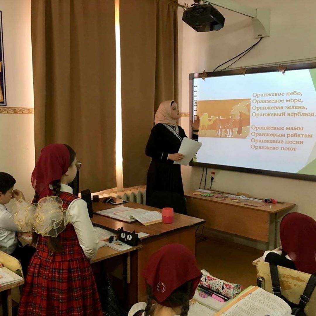 18.01.2020Завершающим аккордом марафона открытых уроков Недели начальных классов стал урок русского языка в 4 Б классе, который провела молодой педагог Арсангериева Макка Юсуповна. Тема урока, которую ребята сформулировали самостоятельно, слушая песню «Оранжевое небо", звучала многообещающе: «Род и число прилагательных». С первой минуты урока все обучающиеся настроились на серьёзное изучение этой непростой темы.
