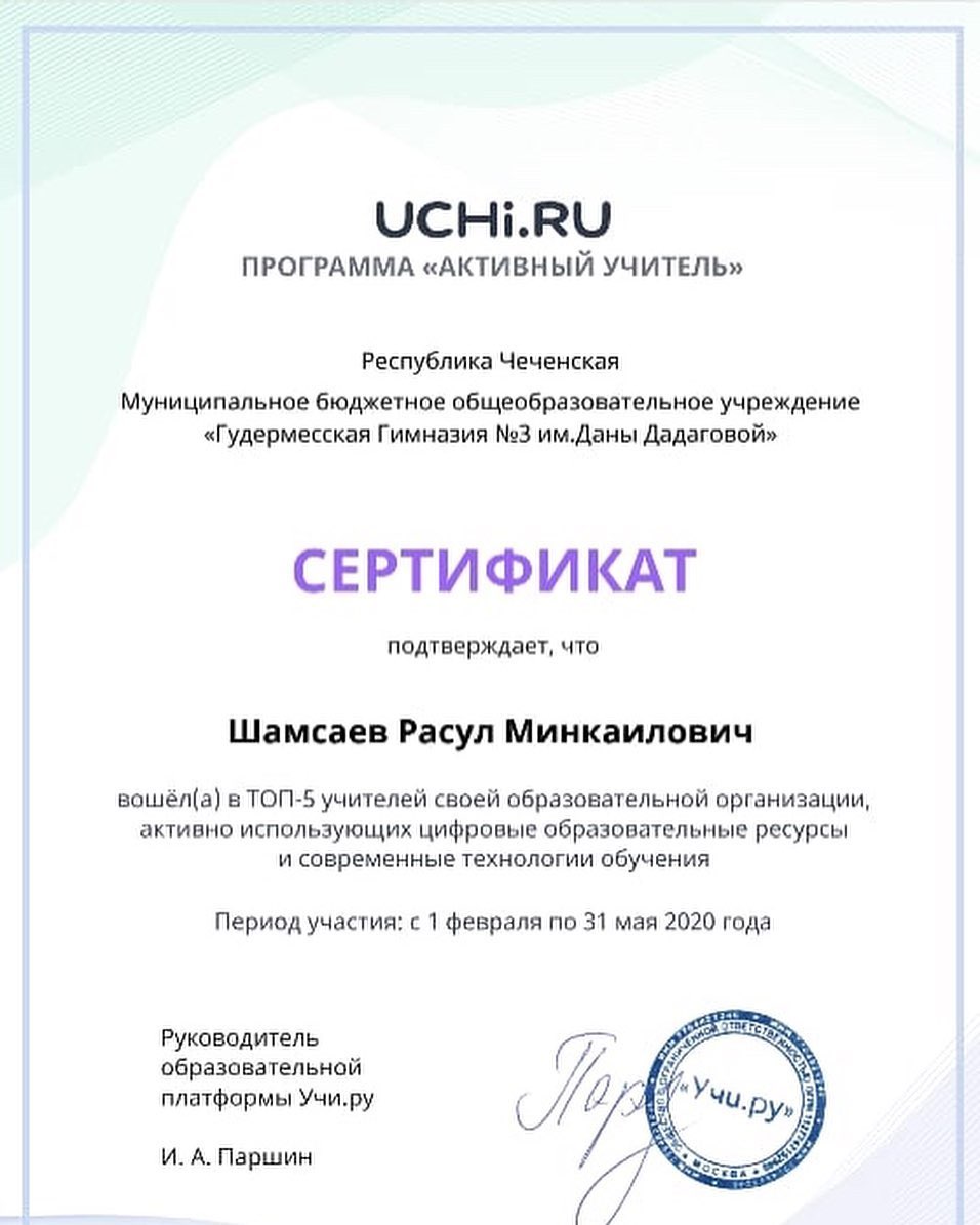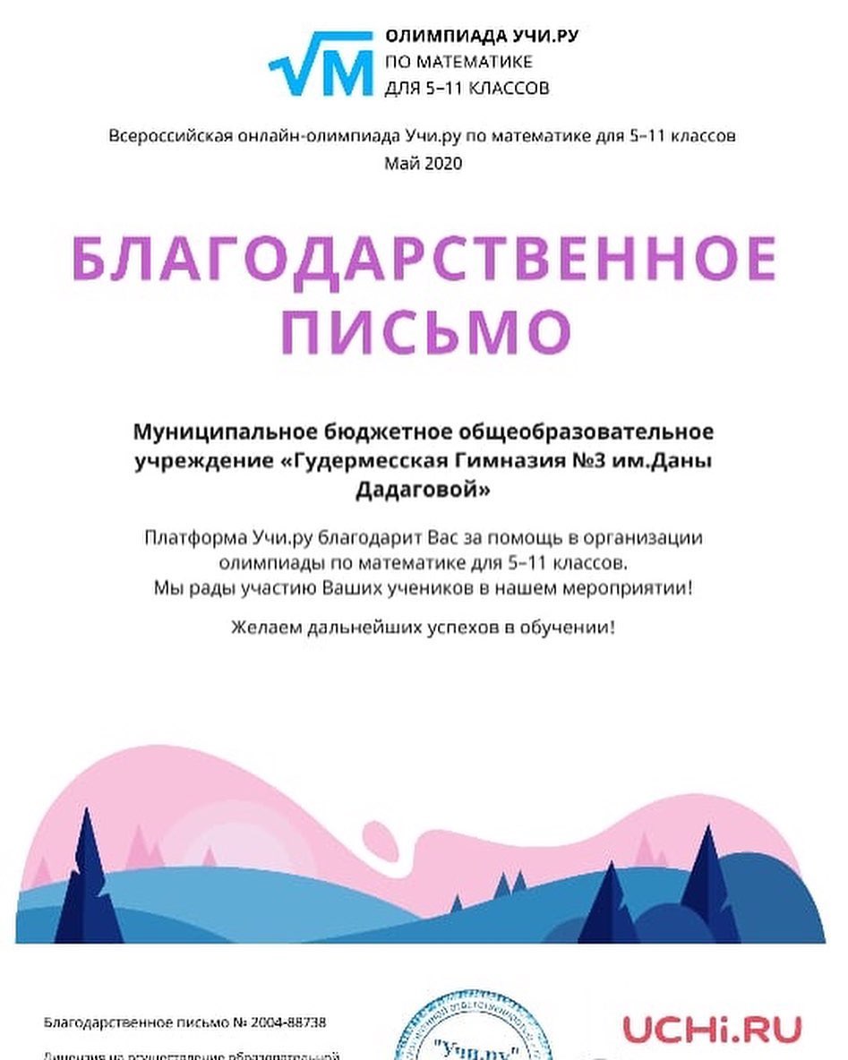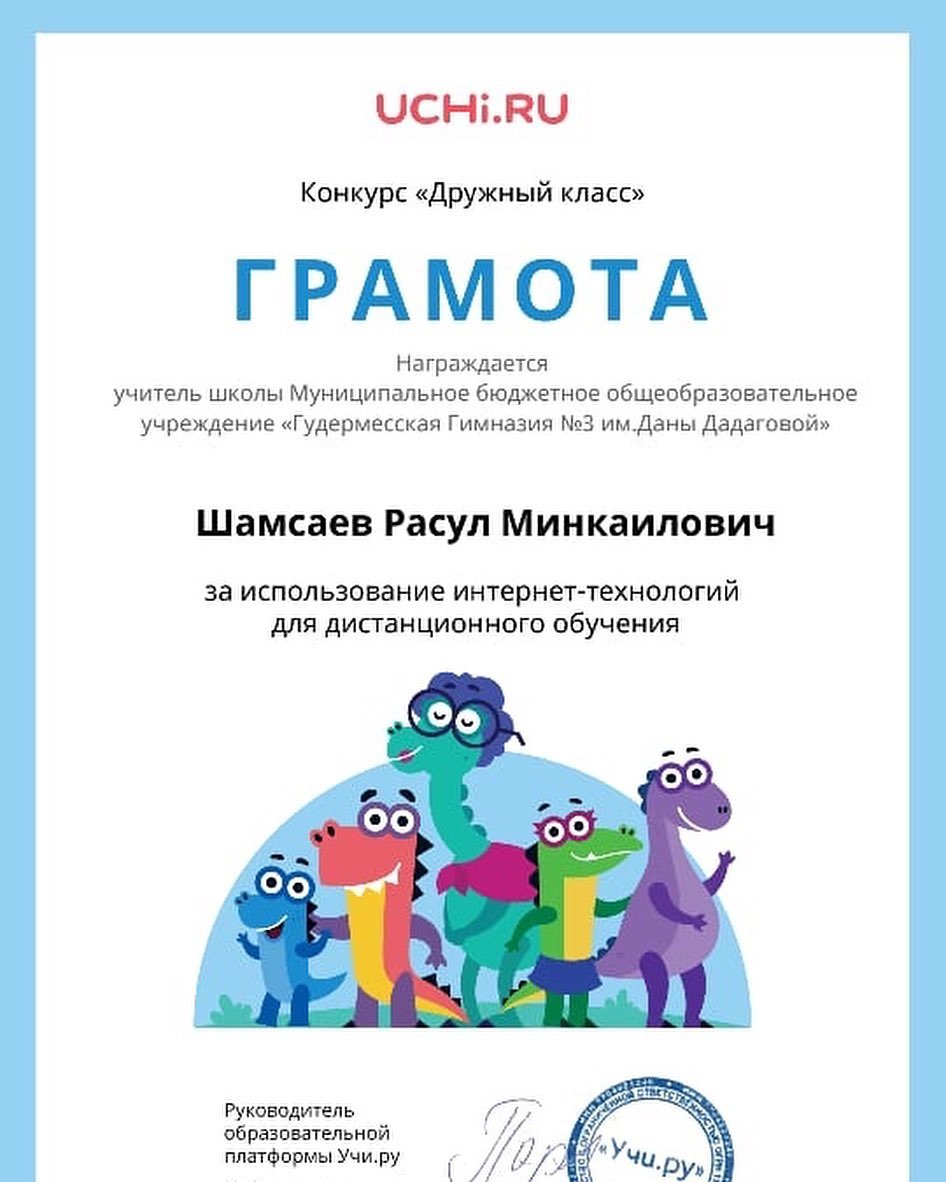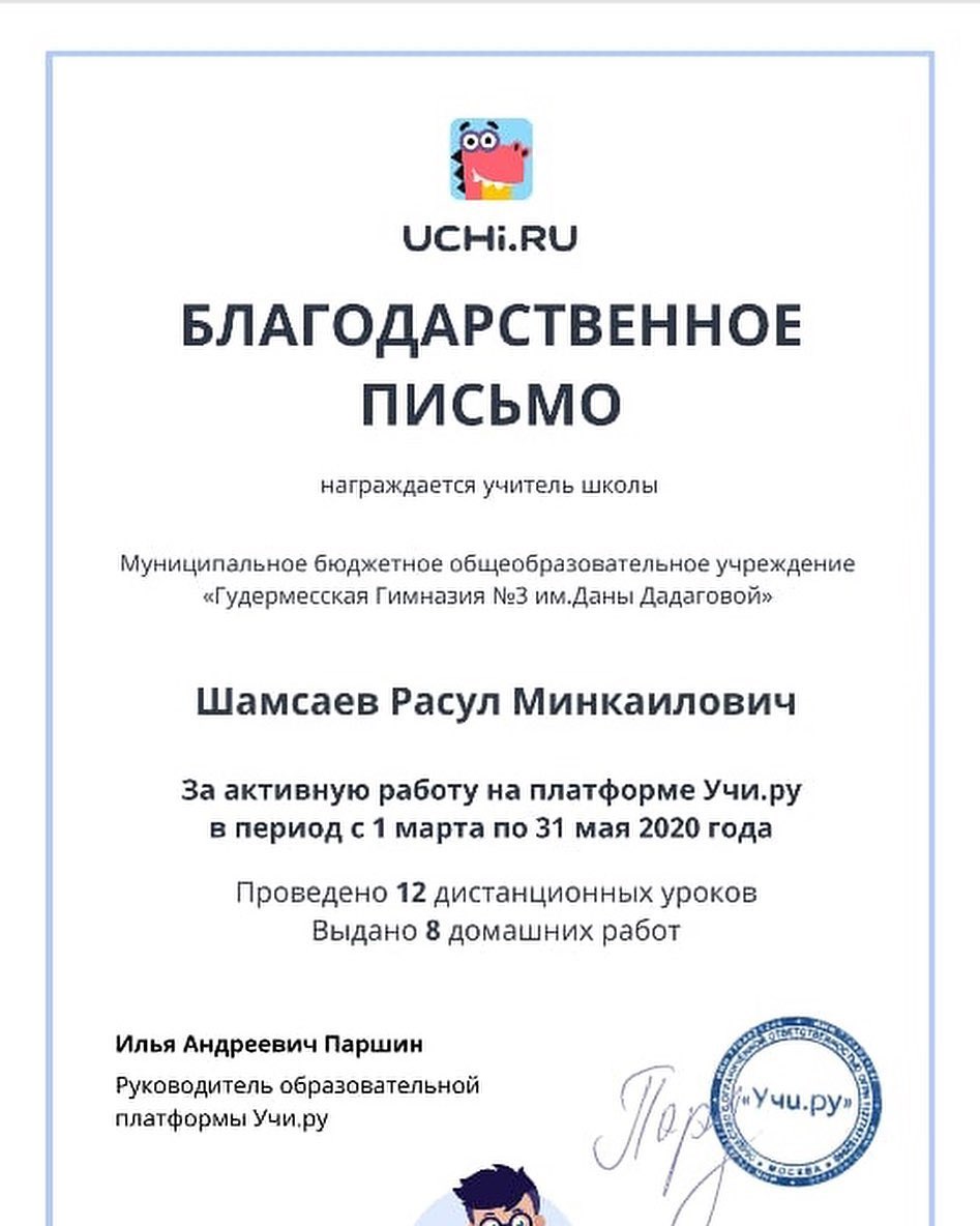 06.06.2020Дорогие друзья, весь этот завершающийся учебный год наши гимназисты под руководством учителей активно работали на образовательных платформах Учи.ру и ЯКласс, радуя высокими достижениями. Вот и сегодня спешим порадовать приятными новостями - пришел новый пакет благодарственных писем, дипломов и сертификатов в адрес гимназии и руководителя кафедры учителей математики и естественно-научного цикла Шамсаева Расула Минкаиловича.