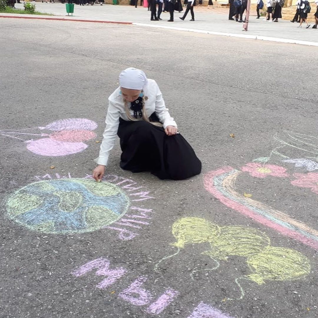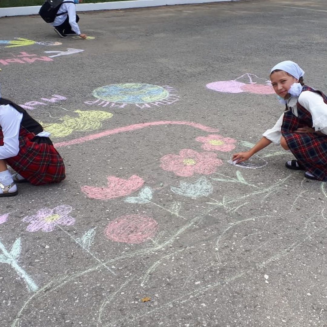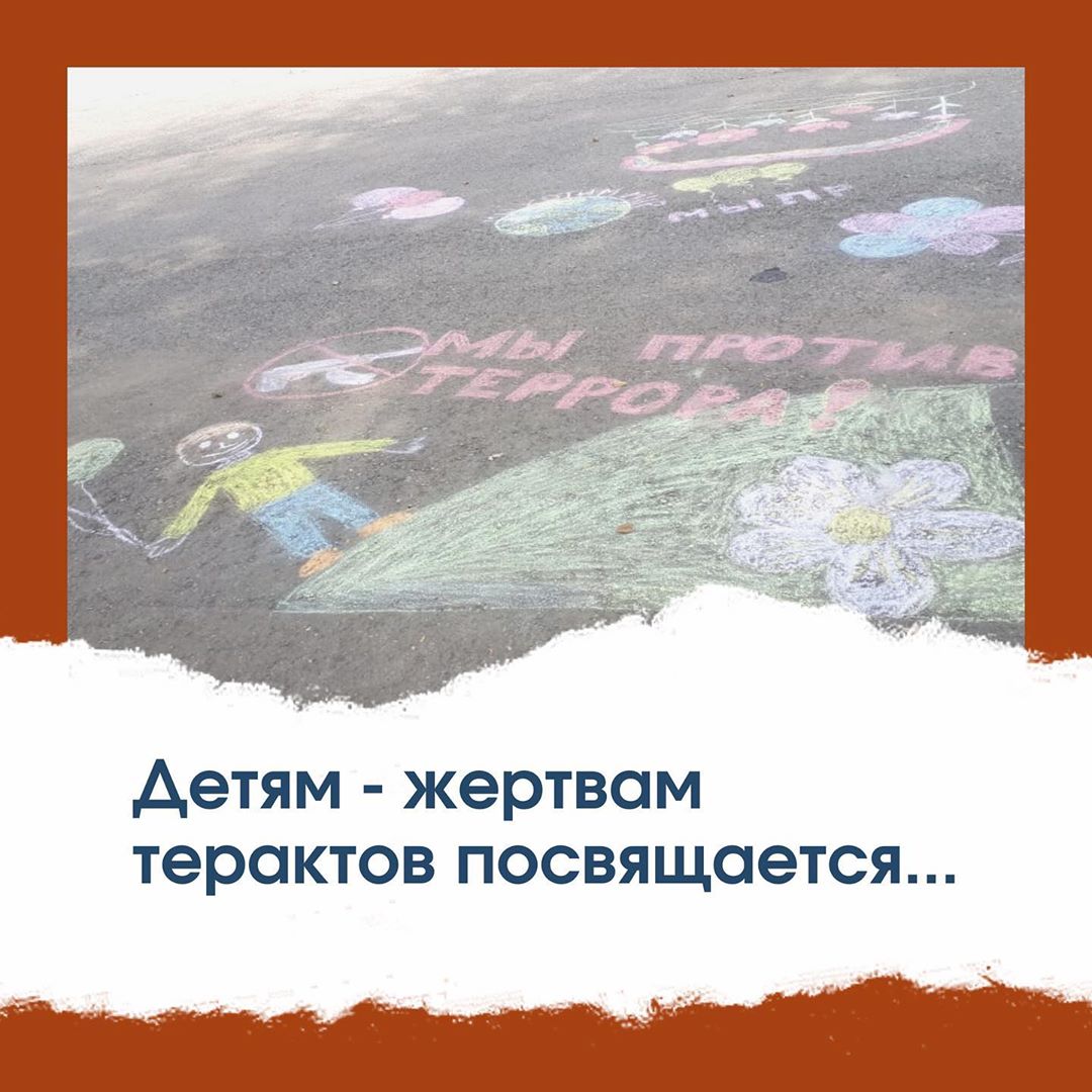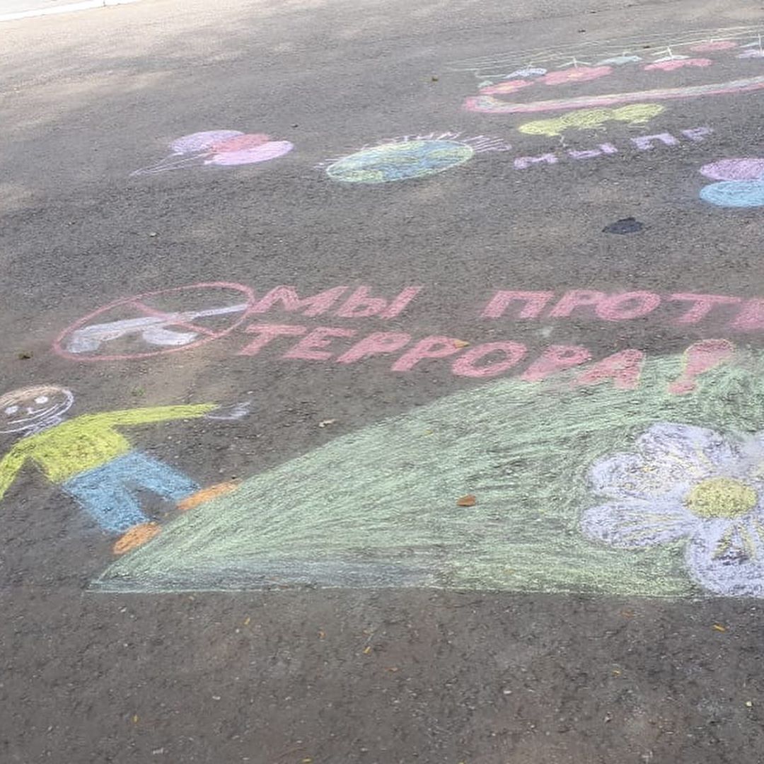 Наши гимназисты вспоминали сегодня всех детей, которые стали жертвами терактов. В память о них был проведен конкурс рисунков на асфальте.