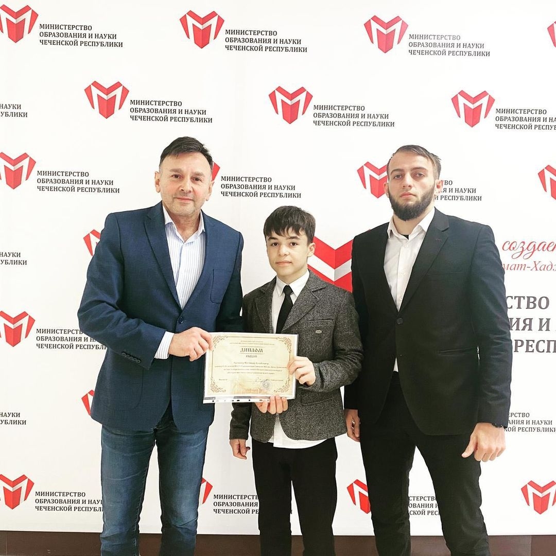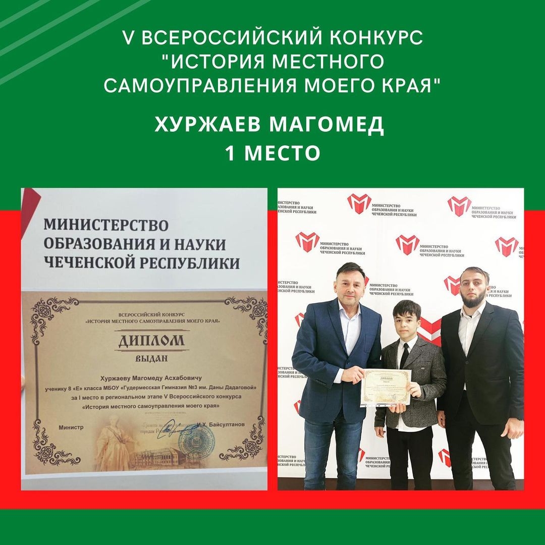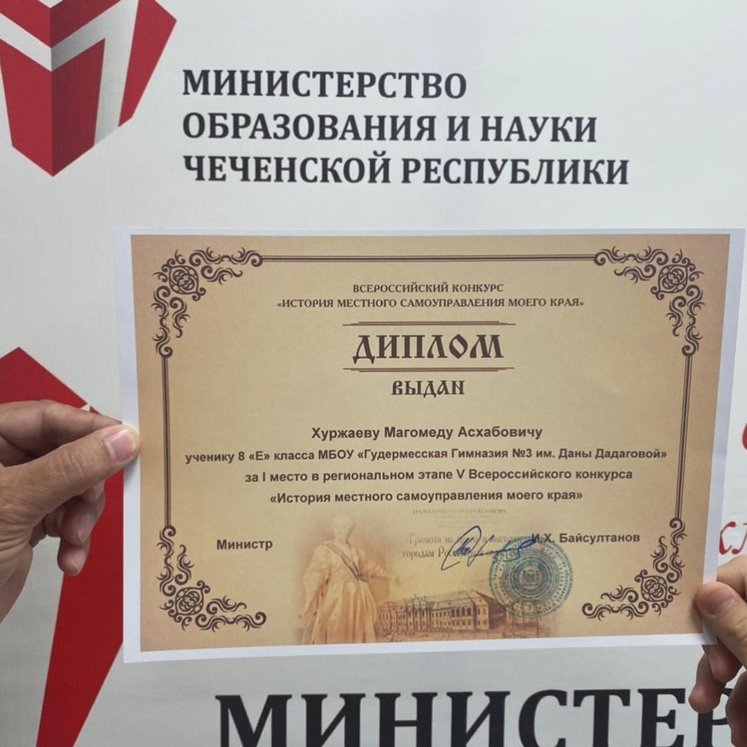 Сегодня в Министерстве науки и образования Чеченской Республики прошло награждение дипломом победителя регионального этапа V Всероссийского конкурса проектов "История местного самоуправления моего края" ученика 8 класса нашей гимназии Хуржаева Магомеда. Сердечно поздравляем Магомеда и координатора проекта Тайсумова Тимура Магомедовича и желаем новых ярких побед.