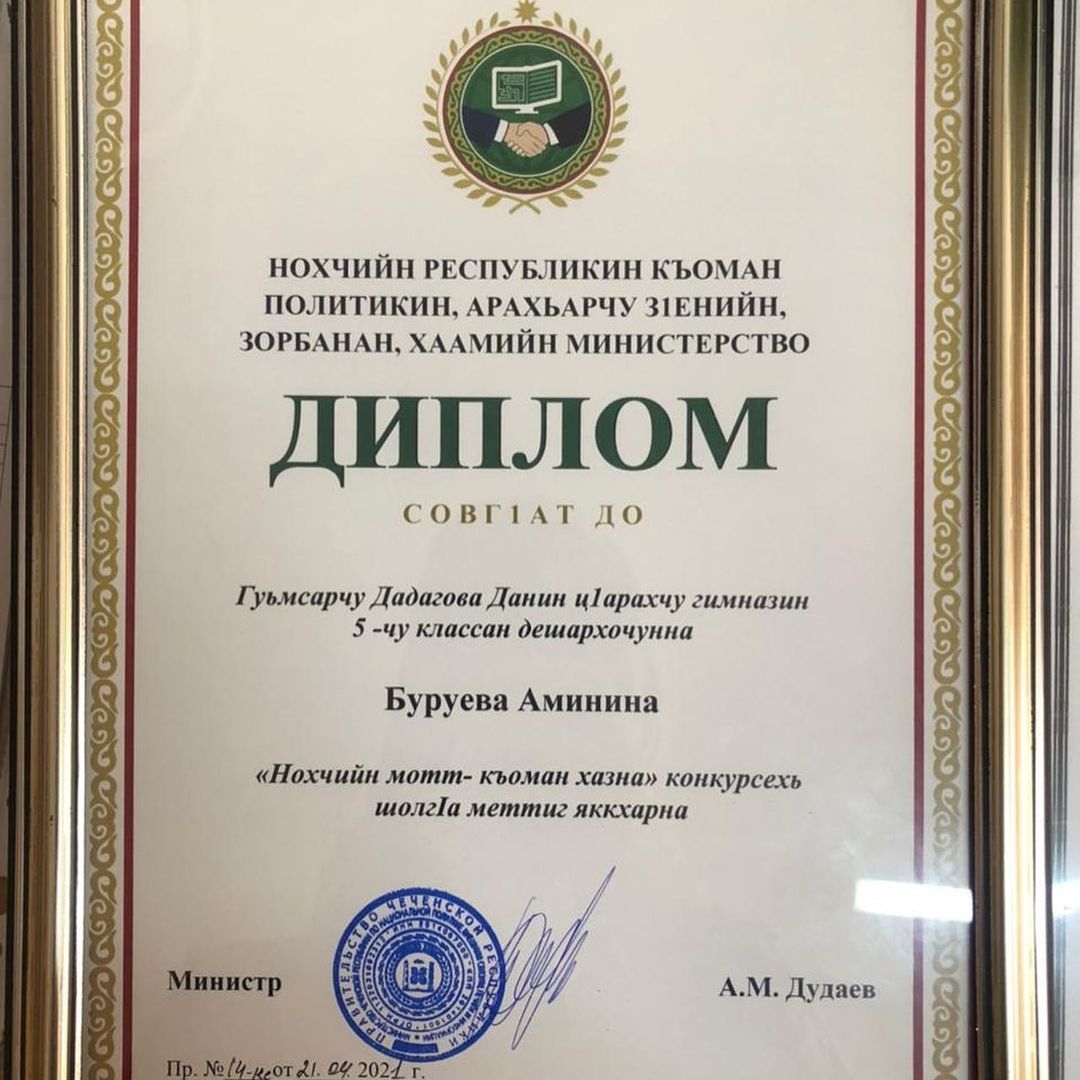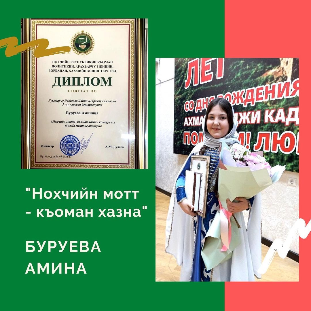 Газета «Даймохк» совместно с Министерством Чеченской Республики по национальной политике, внешним связям, печати и информации провела конкурс "Нохчийн мотт - къоман хазна" для учащихся 1-7 классов. Конкурс был приурочен ко Дню чеченского языка, отмечаемого 25 апреля. С гордостью сообщаем, ученица 5В класса нашей гимназии Амина Буруева заняла достойное второе место.
