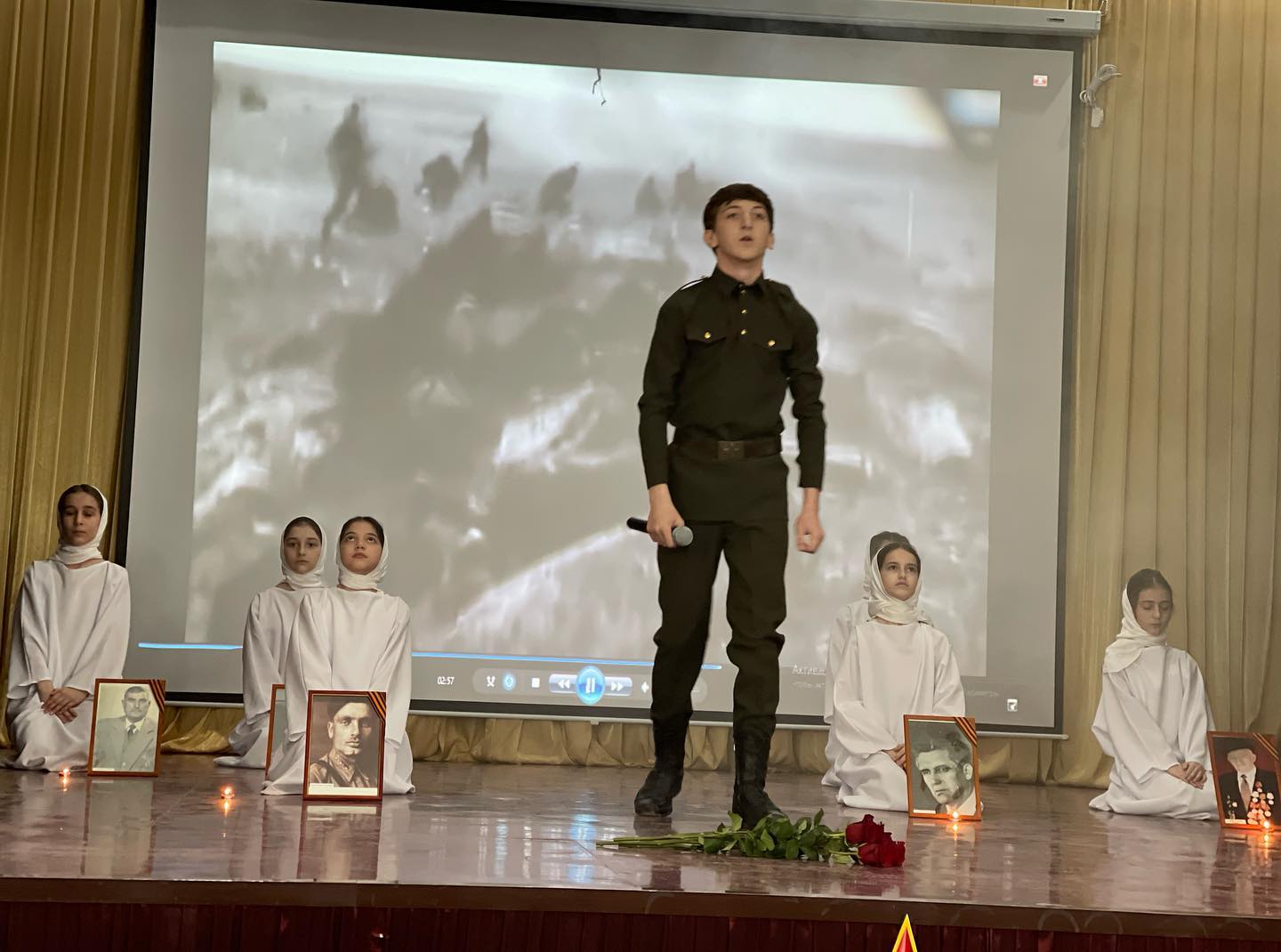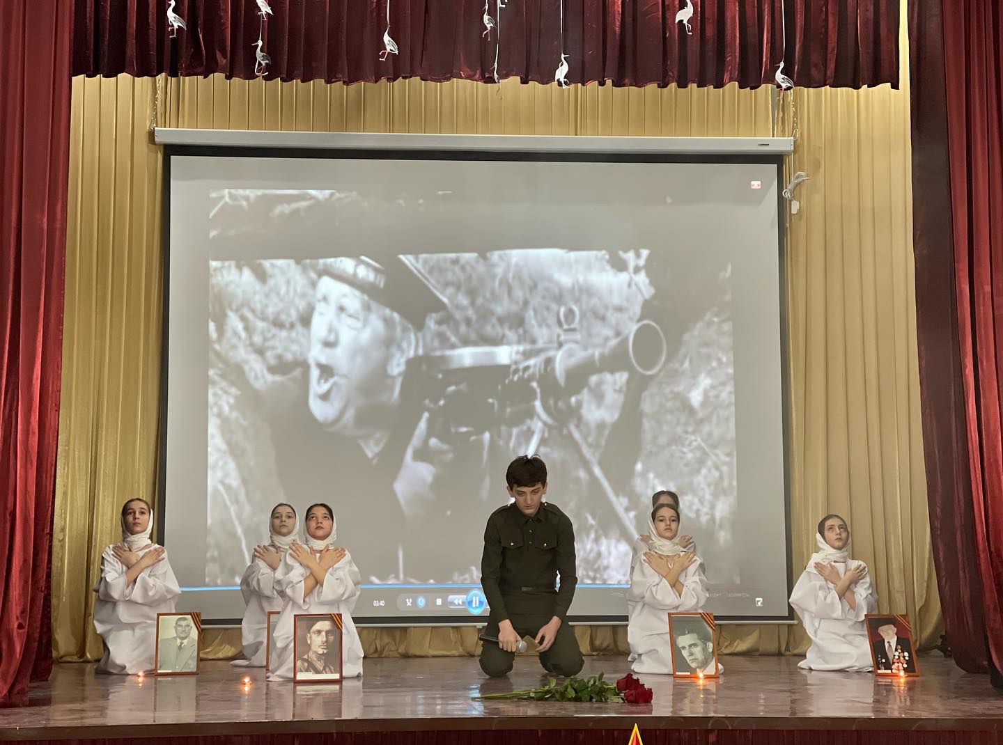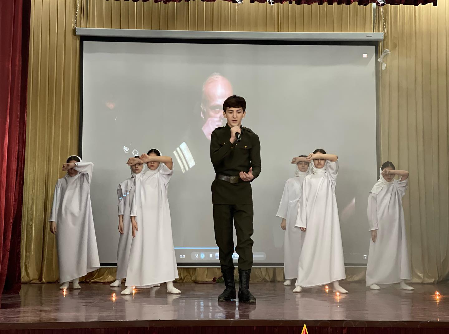 «Верните память». Муниципальный конкурс военно-патриотической песни «От солдата до генерала». Исполнитель -Буруев Адам, обучающийся 9-го класса; инсценировка- Заурбаева Хадиджа, Батырова Ашура, Гайсултанова Саада, Берсанова Хадижа, Тасаева Ашура, Муталипова Алина, обучающиеся 4 А класса.