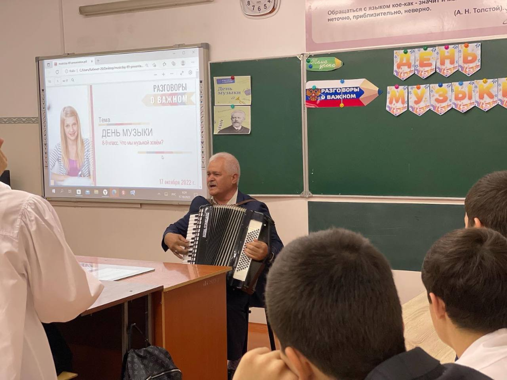 18.10.2022«Разговоры о важном». «Что мы музыкой зовём?» У нас в гостях побывал Заслуженный артист ЧИАССР, Народный артист ЧР, лауреат многочисленных конкурсов, человек, отдавший более 50 лет служению творчеству, сохранению культурного наследия Республики, который буквально совсем недавно награждён медалью «За заслуги перед Республикой», Абдукаримов Ильяс Идрисович-автор многочисленных песен и мелодий, исполняемых известными музыкантами и певцами ЧР. Ильяс Идрисович рассказал детям о своём творческом пути, познакомил с разновидностями музыкальных инструментов, напомнил детям, что в Чеченской Республике очень много талантливых композиторов,поэтов, которые известны по всему миру.