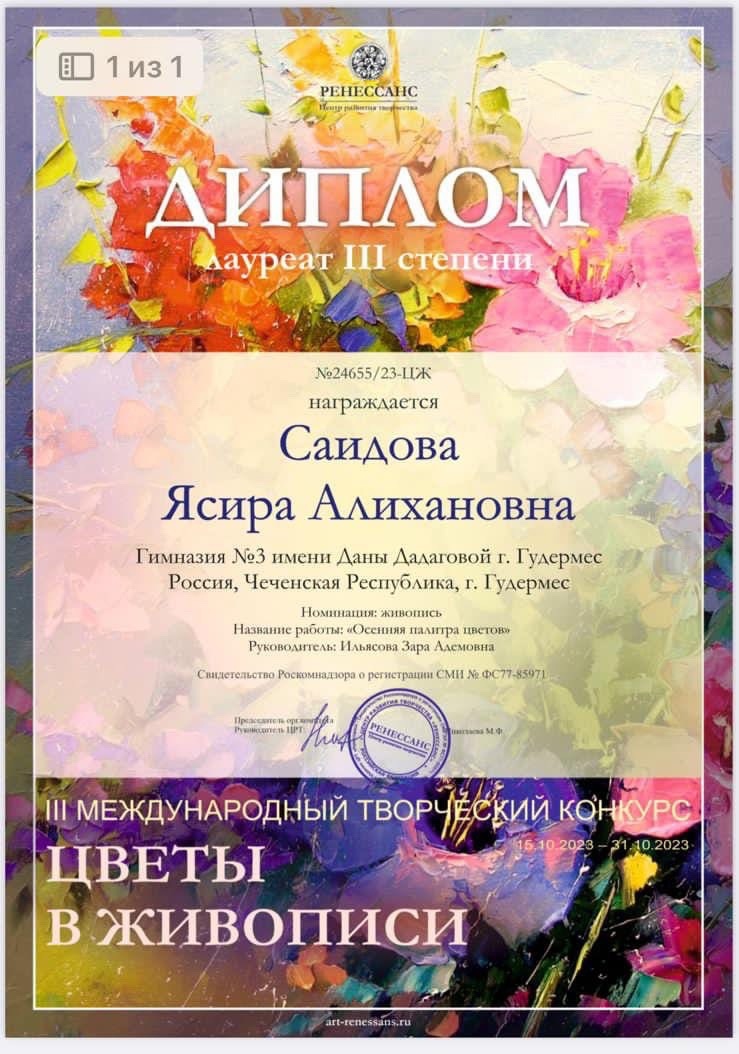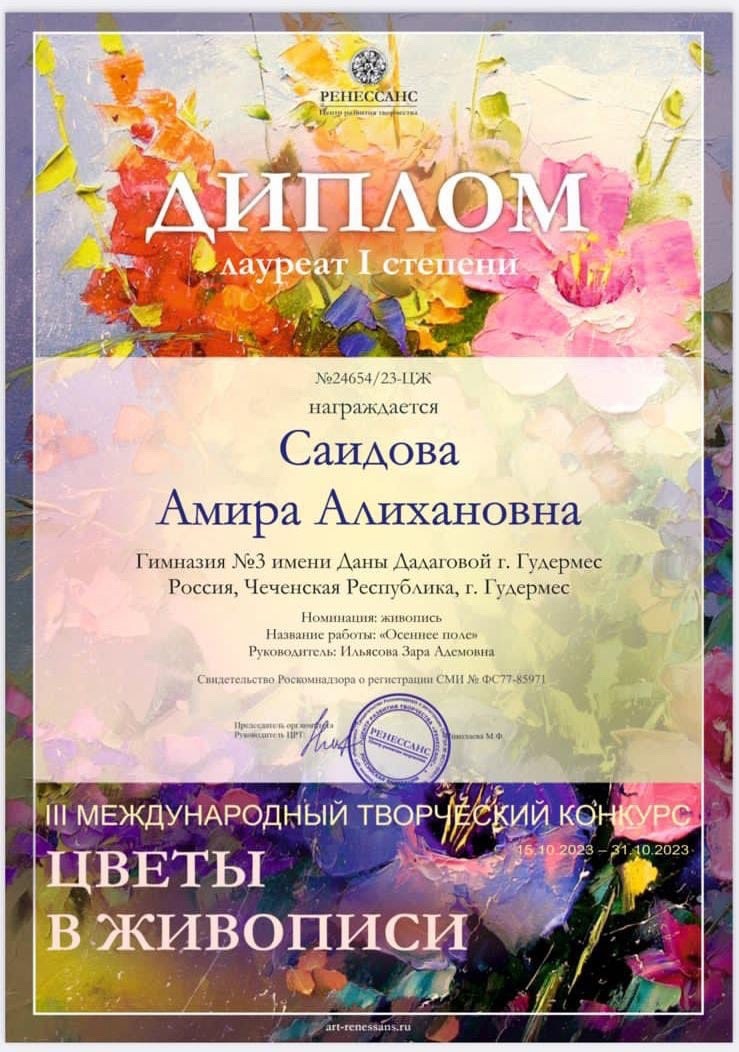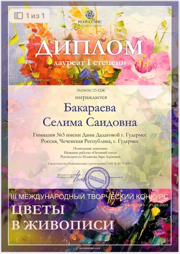 13.11.2023Делимся с вами нашими новостями.Обучающиеся гимназии стали лауреатами I, II, III степеней ІII МЕЖДУНАРОДНОГО ТВОРЧЕСКОГО КОНКУРСА «ЦВЕТЫ В ЖИВОПИСИ» в номинации - живопись. Ребята представили на суд жюри работы: «Осенний натюрморт»; «Осеннее поле»;»Осенний этюд»; «Ветка осенних цветов», «Осенний мотив». Даша т1аьхье беркате йойла!