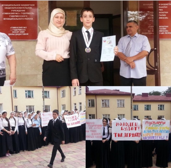 11.09.2017В сентябре 2017 года в г. Анапе проходили 10 юбилейные Всероссийские юношеские игры боевых искусств. Исаев Булат, ученик 8 Б класса стал чемпионом! Занял 1 место в соревнованиях по "Киокусинкай"! И к тому же был награждён отдельной грамотой "За красивый бой"! Педагогический коллектив и учащиеся гимназии торжественно встретили победителя! Желаем ещё больше побед, удачи и успехов в спорте и учебе!