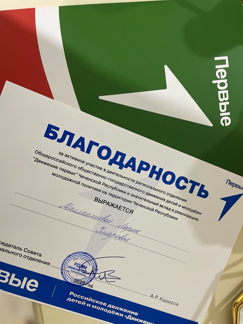 30.12.2023За активное участие в деятельности Регионального отделения Общероссийского Общественно-Государственного Движения детей и молодежи «Движение первых» Чеченской Республики и значительный вклад в реализацию молодежной политики на территории ЧР благодарностями отмечены и наши педагоги: Асхабова Рована Бадруддиновна и Маллаалиева Лариса Умаровна. Дала т1аьхье беркате йойла!