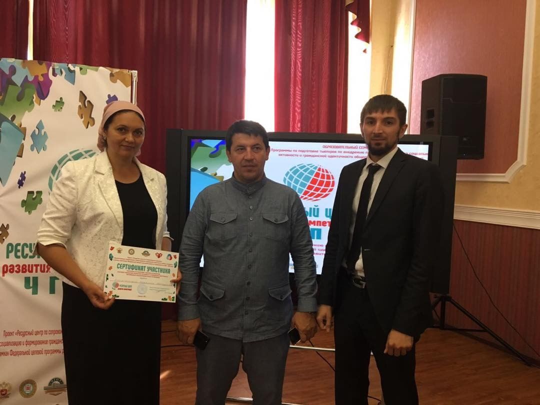 Ректор ЧГПУ Х-А.С. Халадов вручил Анжелике Наврадиевне сертификат по подготовке тьюторов по внедрению программ повышения социальной активности и гражданской идентичности обучающихся общеобразовательных организаций.