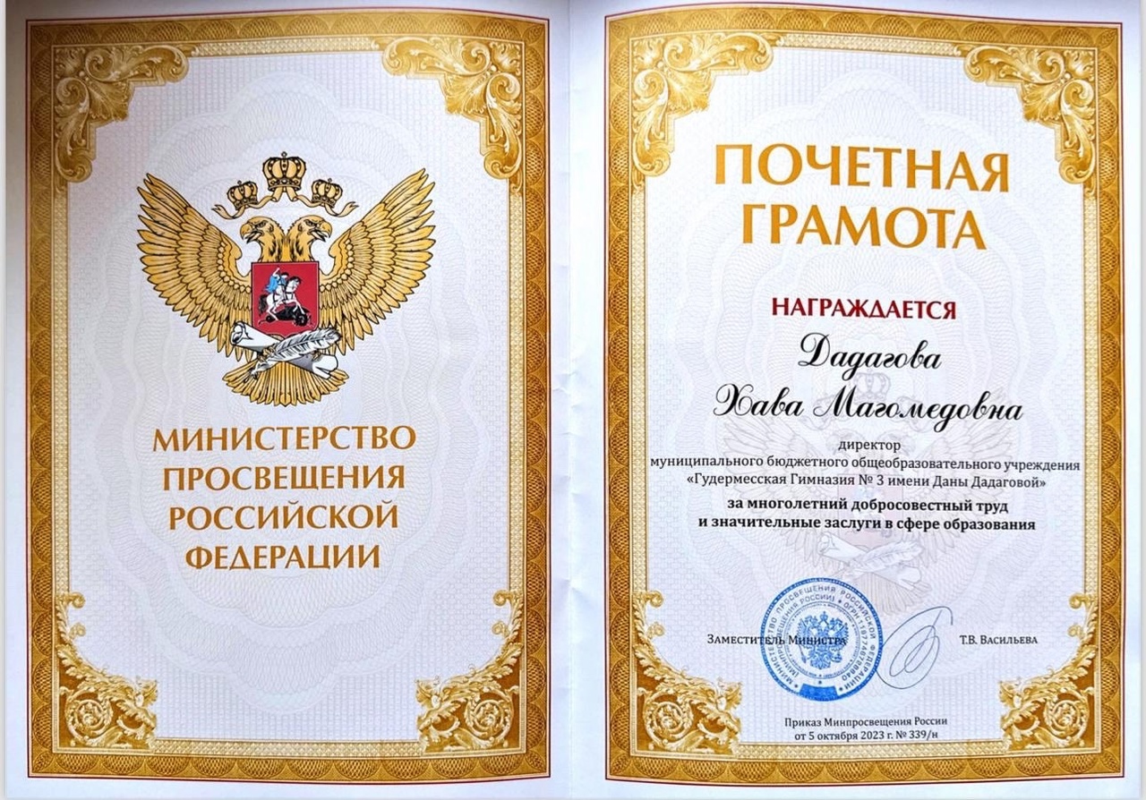 Наш директор ДАДАГОВА ХАВА МАГОМЕДОВНА награждена ПОЧЕТНОЙ ГРАМОТОЙ МИНИСТЕРСТВА ПРОСВЕЩЕНИЯ РФ за многолетний добросовестный труд и значительные заслуги в сфере образования.