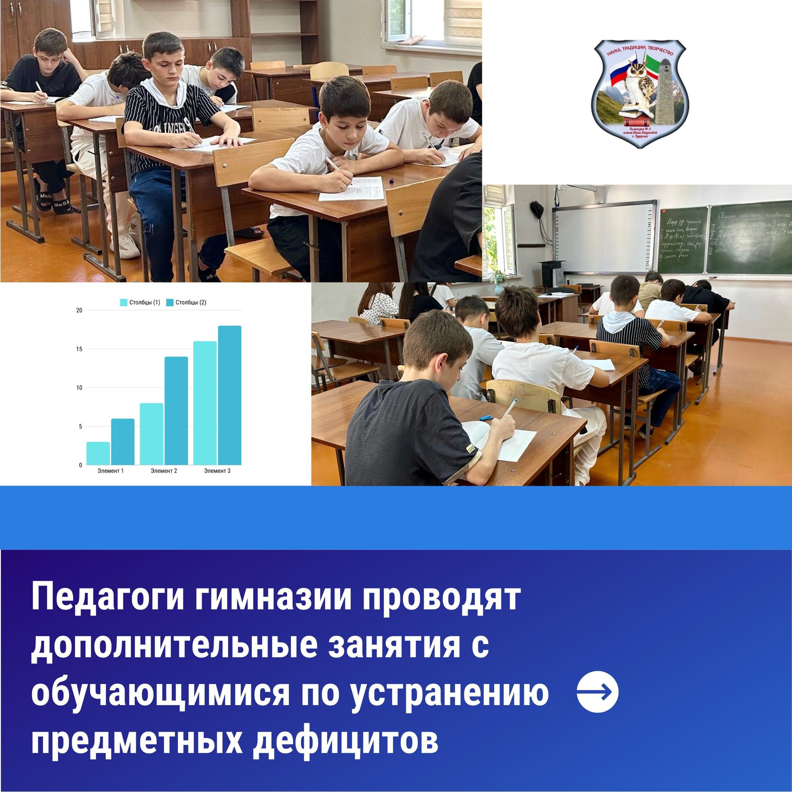 08.08.2024Во исполнение поручения министра образования и науки Чеченской Республики Дааева Х.- Б. Б. педагоги гимназии проводят дополнительные занятия с обучающимися по устранению предметных дефицитов.
