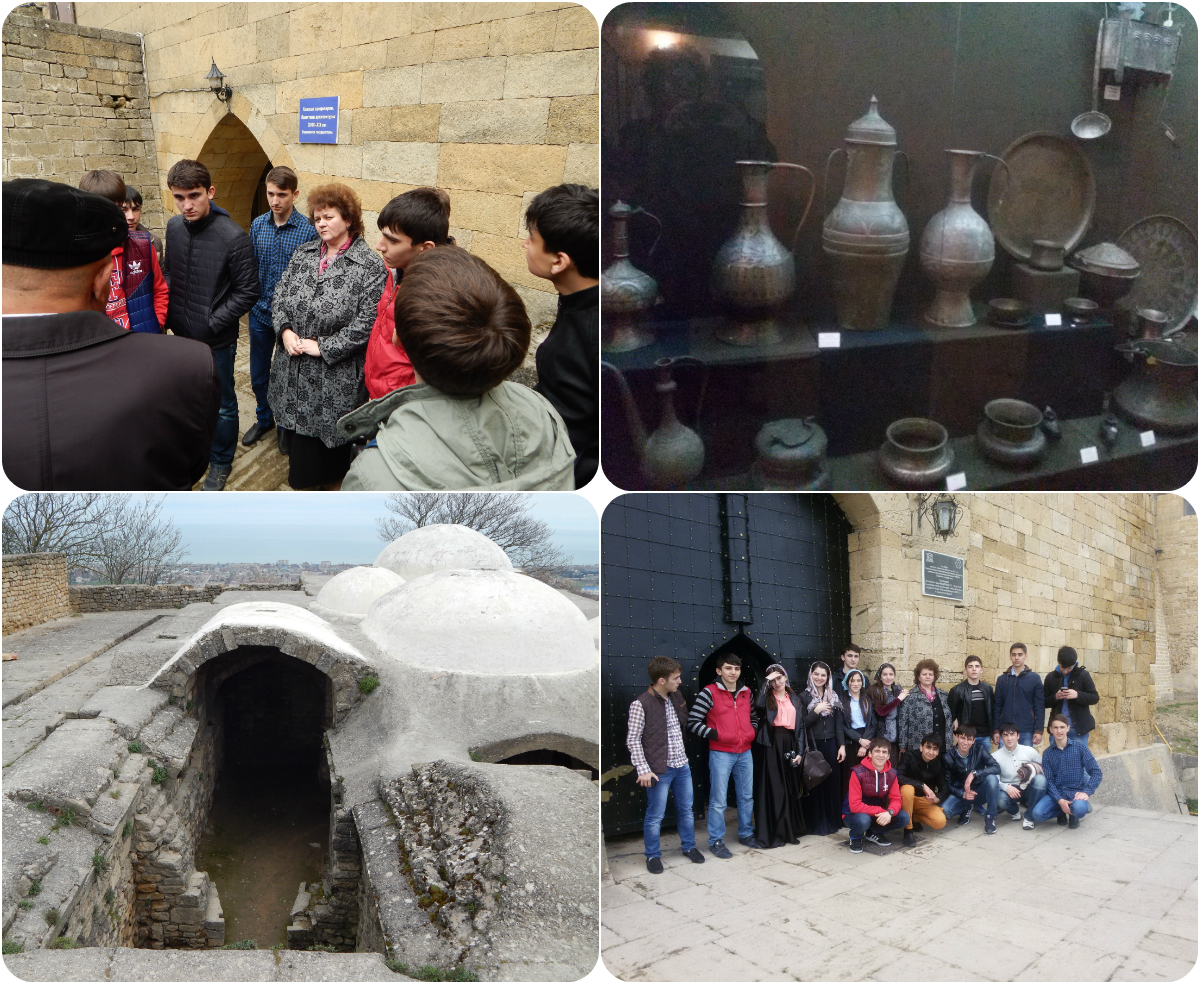 19 апреля 2015 года учащиеся 10 Г класса МБОУ «Гимназия № 3 г. Гудермеса» под руководством классного руководителя Ильясовой Натальи Анатольевны с целью духовно-нравственного воспитания учащихся, приобщения их к культурному наследию посетили ГБУ «Дербентский государственный историко-археологический и художественный музей - заповедник» Республики Дагестан. Много исторической информации услышали дети из уст экскурсовода.Дербентская крепость - одно из древнейших фортификационных сооружений региона. Уникальное расположение города дало ему название, которое переводится как «Запертые ворота».Цитадель «Нарын-Кала», стена «Даг-Бары», а также историческая часть города Дербента на 2003 год были в числе 12 памятников России и 122 памятников мира, включенных в Список Всемирного наследия ЮНЕСКО. Цитадель «Нарын-Кала» со стеной «Даг-Бары» (протяженностью 42 км) входит в число четырех наиболее крупных фортификаций мира, наряду с Великой Китайской стеной, не сохранившимися Римскими Дунайскими укреплениями и Русскими Засечными Валами. На строительство Дербентских оборонительных сооружений ушло материала в семь раз больше, чем на строительство одного из семи чудес света - пирамиды Хеопса.Настоящее и будущее российского общества и государства определяются духовно-нравственным здоровьем народа, бережным сохранением и развитием его культурного, духовно-нравственного наследия, исторических и культурных традиций и норм общественной жизни, сохранения культурного достояния всех народов России.