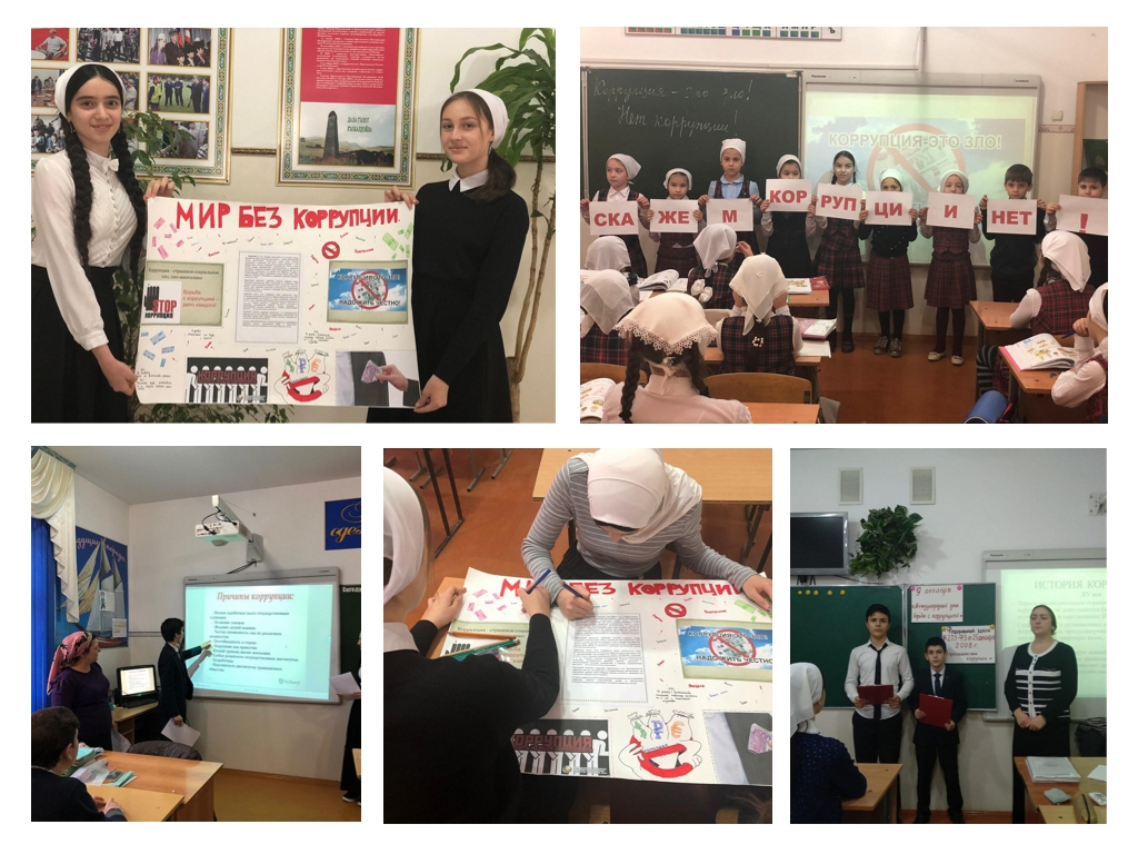 07.12.2018В преддверии Международного дня борьбы с коррупцией в МБОУ «Гудермесская Гимназия №3 им. Даны Дадаговой» с целью формирования гражданской ответственности, негативного отношения к такому явлению как коррупция, устойчивой позиции по предупреждению коррупционных проявлений; осознания важности таких понятий, как соблюдение закона, чести и честности проведены мероприятия, направленные на антикоррупционное просвещение.